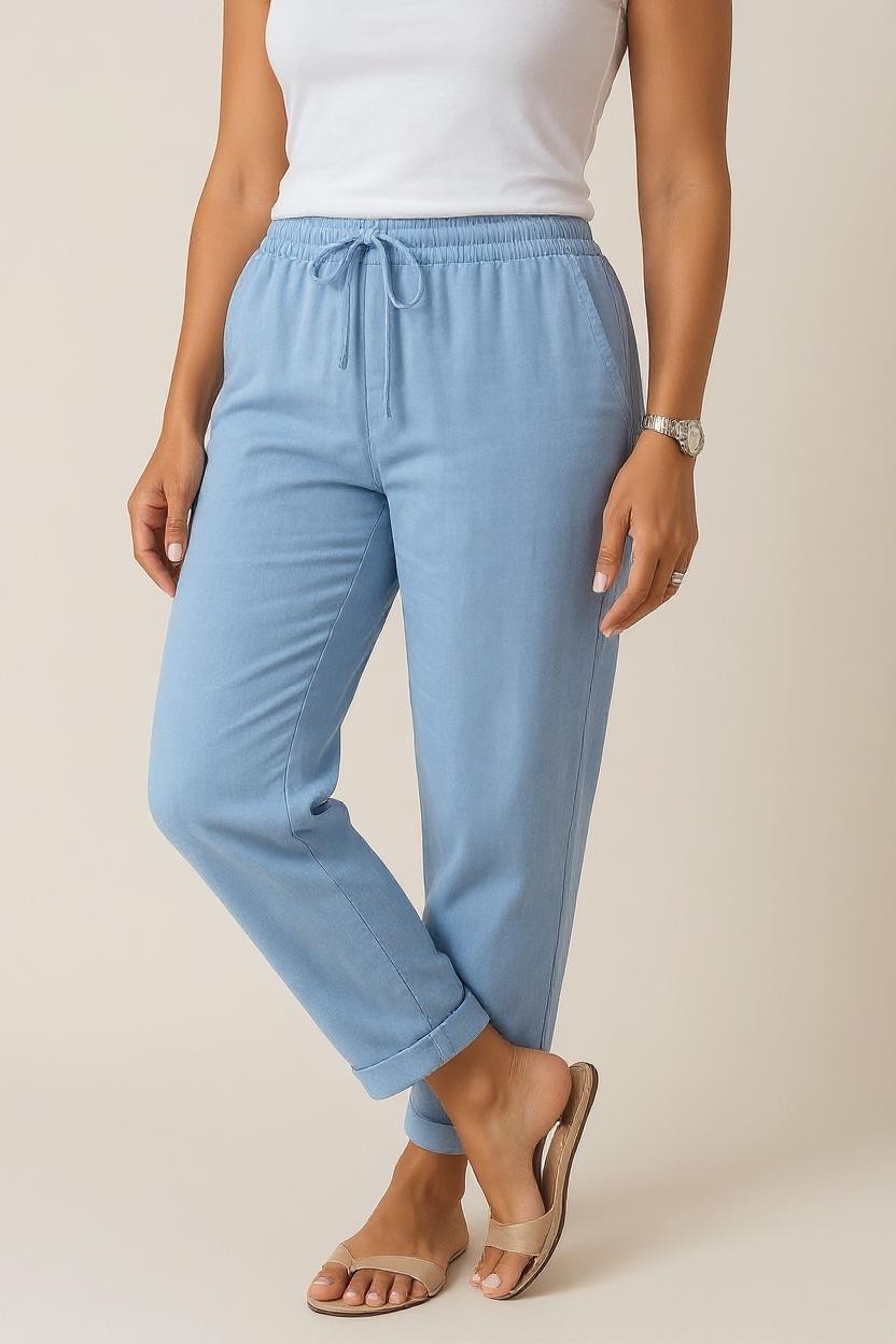 Disse afslappede bukser kombinerer naturlige lethed med polyesterens holdbarhed og smidighed, hvilket giver en ideel balance mellem stil og funktion. Den elastiske talje med justerbar snøre sikrer en skræddersyet pasform, mens det luftige snit og de opsmøgede ben understreger det afslappede udtryk. Perfekte til både hyggestunder derhjemme og stilfulde sommerdage på farten.