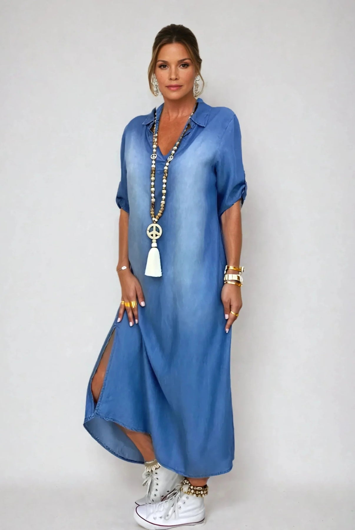 Luna er den lange kjole i denimlook, som du nemt tager på direkte fra skabet – uanset om du er på farten, på arbejde eller bare slapper af. Fremstillet af blød, åndbar denim med et let vasket look, udstråler den afslappet stil uden at gå på kompromis med komforten.